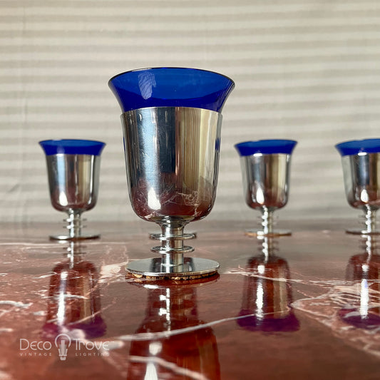 1930s Set of 6 Rare Machine Age Deco Chrome & Cobalt Cocktail Cups - Walter von Nessen