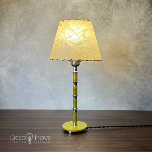 1930s Streamline Deco Segmented Green Bakelite and Chrome Stick Lamp w/Fiberglass Shade