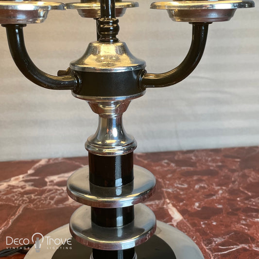 1930s Streamline Deco Machine Age Black and Chrome Bouillotte Candelabra Lamp