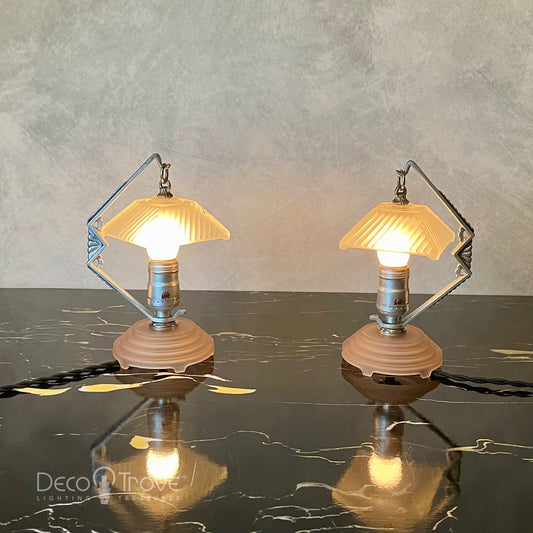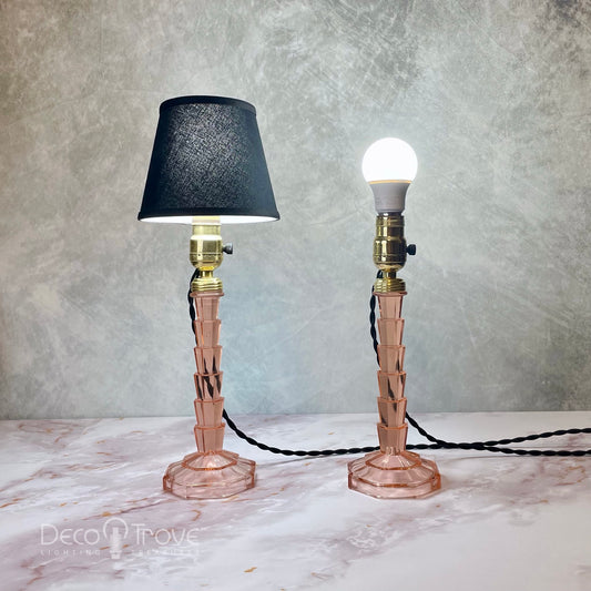 Pair of Indiana Glass Art Deco Stacked Tea Room Pink Depression Glass Lamps