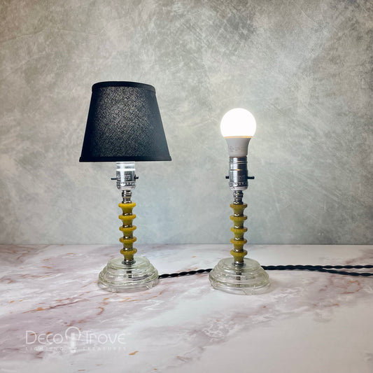 Pair of 1930s Houze Glass Art Deco Octogonal Jadeite and Fluted Green/Swirled Amber Bakelite Lamps