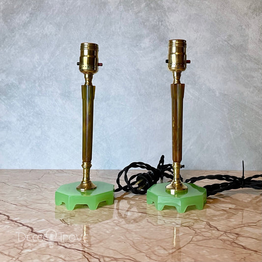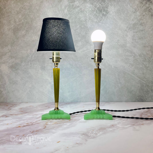 Pair of 1930s Houze Glass Art Deco Triangular Jadeite & Fluted Bakelite Lamps