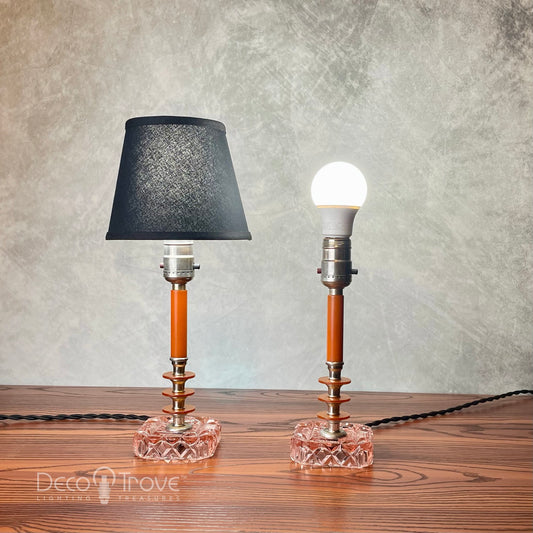 Pair of 1930s Streamline Deco Orange Bakelite and Pink Depression Glass Lamps