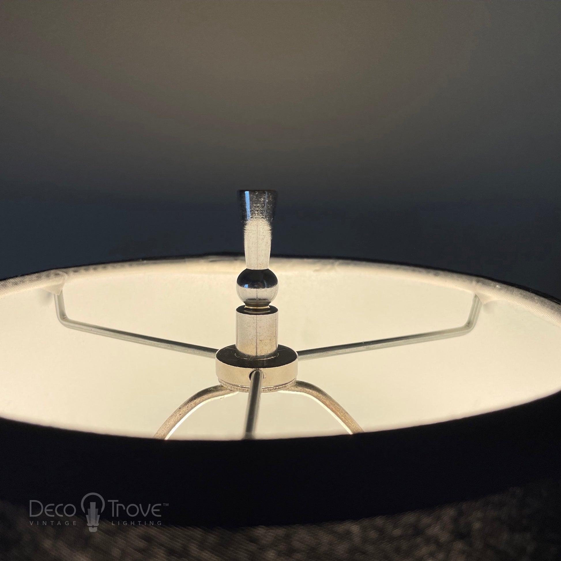 Bring the celestial beauty of the cosmos into your living space with the Black and Chrome Saturn Lamp w/Harp & Finial. This lamp displays the futuristic style of the 1933 World's Fair, with its black and chrome finish providing a timeless look that will never go out of style. Add a bit of space cadet style to your décor with this unique piece.